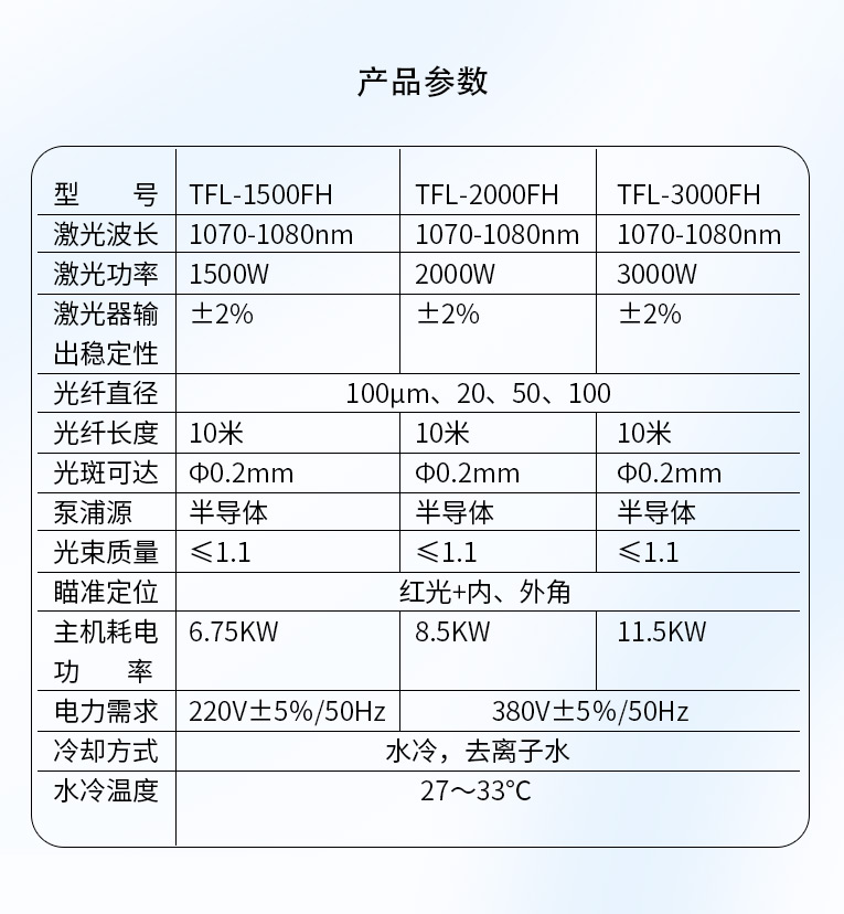 | 激光功率 | 1000W | 1500W | 2000W | 3000W |